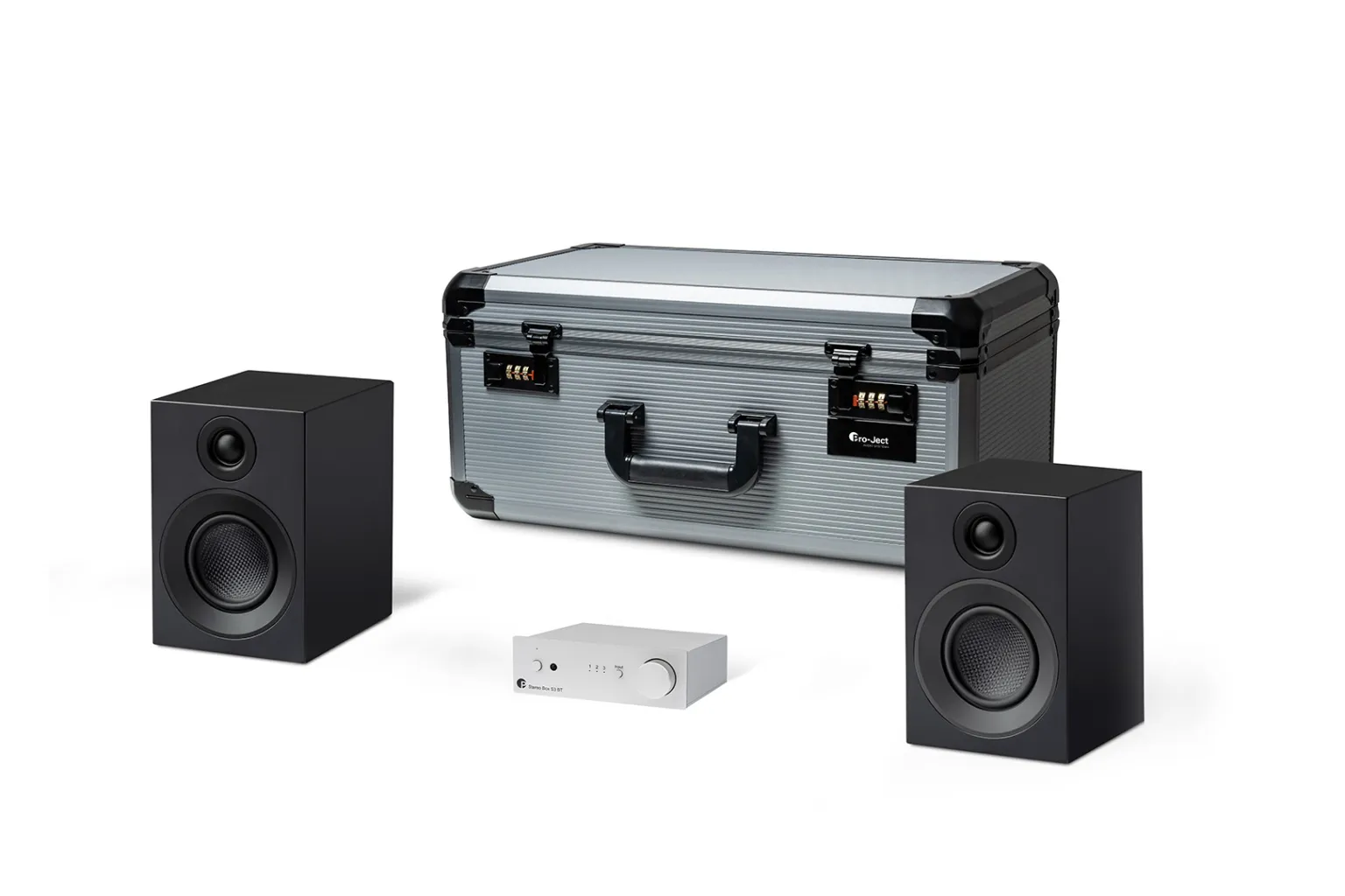 Kompaktes audiophiles HiFi-Komplettset mit Verstärker, Lautsprechern und Transport-Flightcase