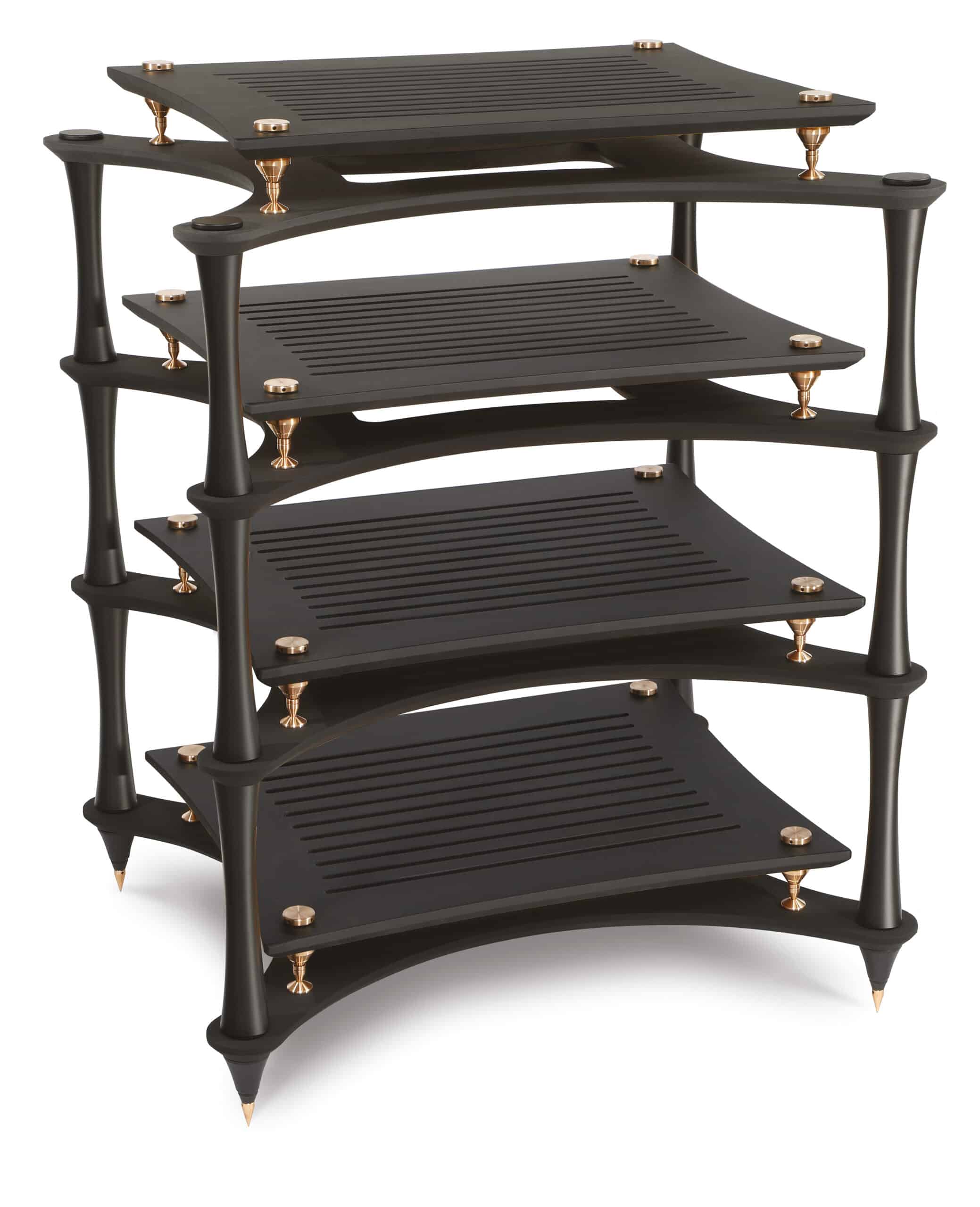 Die Böden bestehen aus massivem Bambus und sind in vier hochwertigen Oberflächen erhältlich: Natural, Cherry, Dark und Black. Die gebogenen SV Säulen mit 44 mm Durchmesser bestehen aus massivem Aluminium und sind wahlweise in Schwarz oder naturbelassenem Aluminium verfügbar. Aluminium besitzt im Vergleich zu Stahl ein deutlich geringeres Resonanzverhalten und schafft damit eine besonders klangneutrale und vibrationsarme Basis für hochwertige HiFi Komponenten.