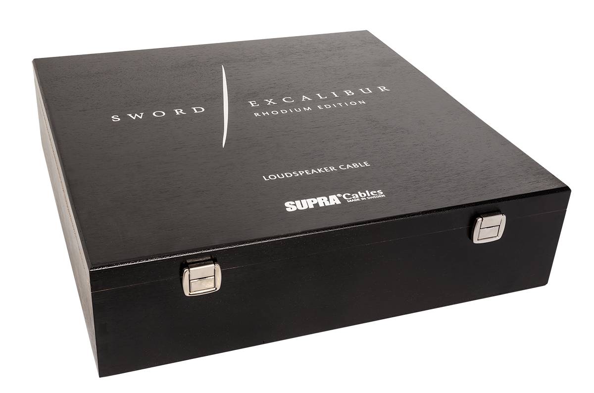 Das Lautsprecherkabel Supra Sword Excalibur wird in einer exklusiven schwarzen Holzkiste gelifert, die sowohl rhodinierte Bananen- als auch Kabelschuhe enthält.